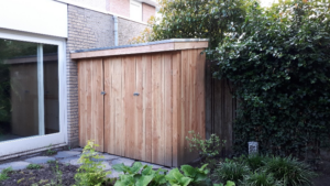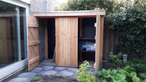 Een schuurtje voor opslag van tuingereedschappen en tuinmeubilair.